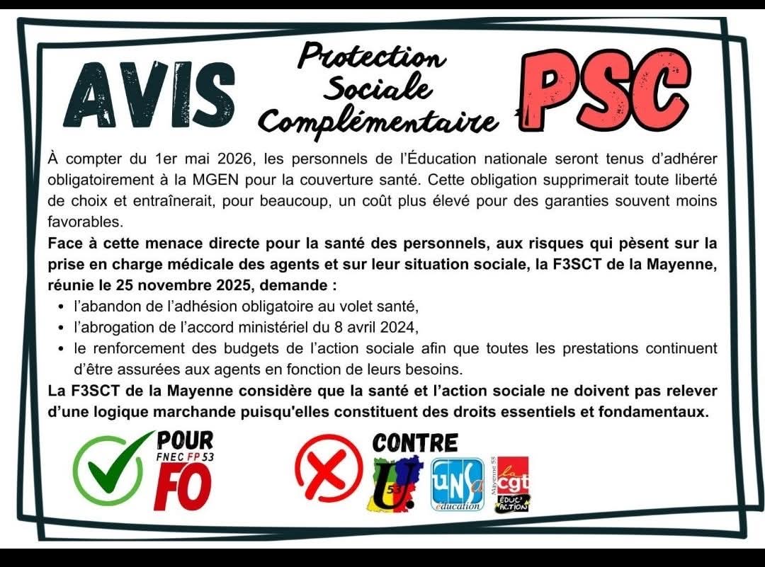 La FNEC FP-FO continuera de combattre la PSC obligatoire, outil de privatisation et de destruction de la Sécurité sociale et de la Fonction publique.
